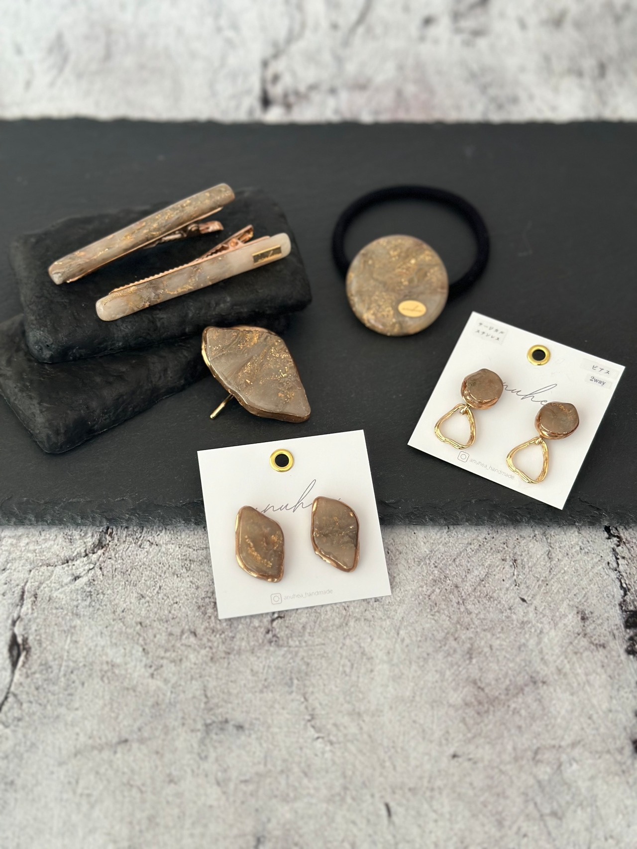 ベージュ×ブラウンにゴールドのロゴプレートがワンポイントのヘアゴムです。